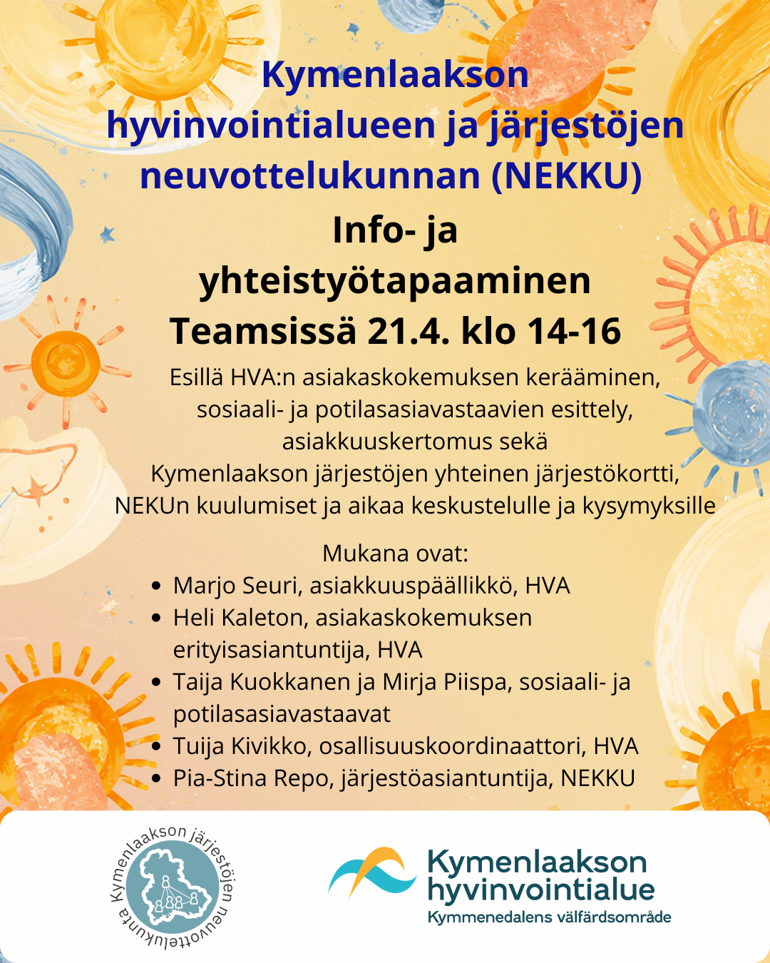 Tilaisuudessa on esillä HVA:n asiakaskokemuksen kerääminen, sosiaali- ja potilasasiavastaavien esittely, asiakkuuskertomus sekä Kymenlaakson järjestöjen yhteinen järjestökortti, NEKUn kuulumiset ja aikaa keskustelulle ja kysymyksille.